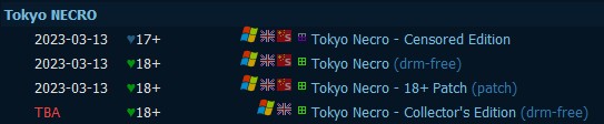 >>7614Do you mean Tokyo Necro specifically, or eroge/bishoujo in general? There are a LOT of all-ages eroge with English translations, but as you acknowledged, most of those are on Steam. As for fan translations of all-ages games, that is a bit more uncommon (although there are examples where you can disable the sex scenes, like with the Fate/Stay Night fan TL). In general, your best bet is to look for VNs that have an all-ages version that adds something to the original or was released on consoles (Like the Realta Nua version of Fate, Dies Irae, AIR etc). It could also help to look at the "in-game sexual content toggle" and "only avoidable sexual content" tags. While it's rare, there are some games that have the sex scenes entirely detached from the story, like with Eden*. It's a small example, but as far as I'm aware, Baldr Force only has a fan TL of the all-ages version; I don't think there's a way to read the 18+ version in English.
