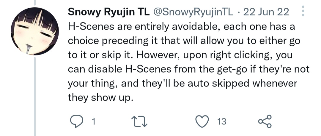 I'm the one embarking on the challenge to play every VN tagged with BL on VNDB and I've been stuck on a 30 hour furry game for weeks that I just do not have the motivation to read. Like outside of it just not appealing to me it's so visually bland and poorly written I want to give up. Blah. It feels like quiting/cheating though so I at least want to power through one route.