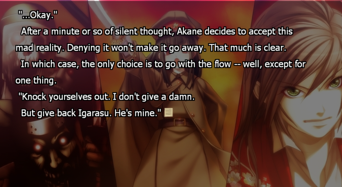 I also started Mamiya: Doomsday Dreams this year, but I have mixed feelings so far. I have not finished it yet. I read the prequel a very long time ago, so I’ve had to backtrack and review parts of the first in case what I’ve forgotten impedes my enjoyment. I’m hoping to complete it soon, as it’s the only VN I’m currently reading, and I don’t want to start another one until I’m done with it.