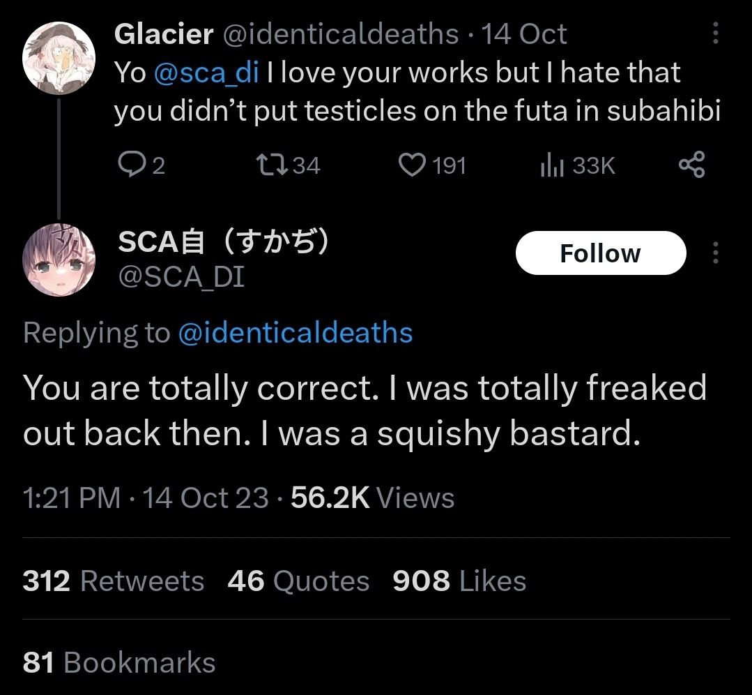 >>8326She needs to ditch the pov stuff and do an actual bl project, I like her characters and I enjoy the psychological aspects but it never goes as hard as I'd want it to.