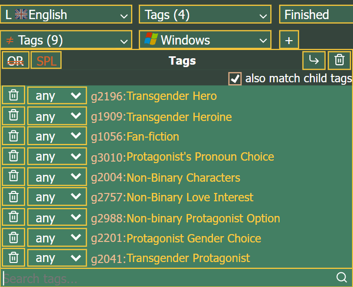 Basically the criteria is: BL/Yaoi, in English or has a translation, and it doesn't have the excluded tags like Trans and Nonbinary… and Fanfiction. Which I didn't initially exclude but then I read a Genshin one that I was so lost in I decided to exclude them.