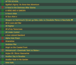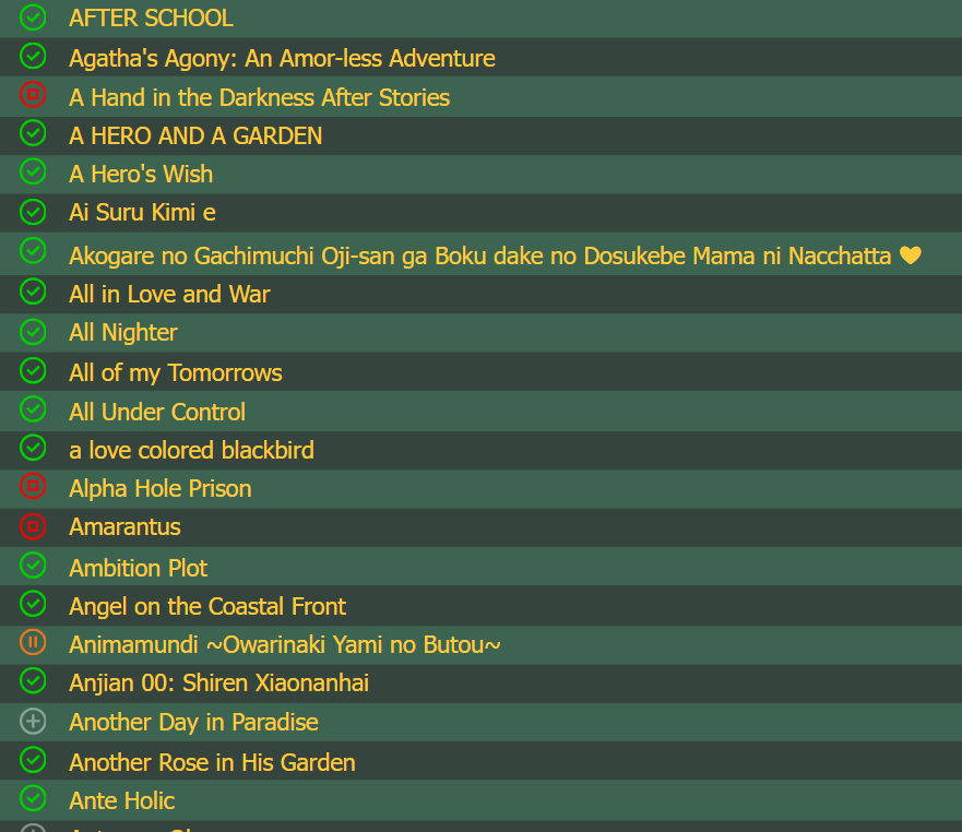 Anyway here's the parameters I think I shared it in the BLVN thread but I've streamlined it a bit. Here's also a small showcase of what I'm doing. Green means completed, all routes done. Orange means I'll get back to it at some point "stalled." Red means dropped, I did one or more routes but didn't complete it for whatever reason (probably bad). I also have a blacklist which I add the sequels of games I finished but didn't enjoy to. For instance I hated Ambition Plot, so I just went ahead and added Ambition Plot 2 to it and removed it from the challenge. AI games also get blacklisted if I see them.