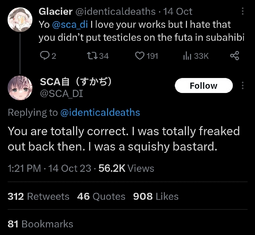 >you don't see it much in Japanese mediaDon't quote me on this, but I'm pretty sure the most popular Japanese gay furry VN was left eternally unfinished, which probably says something about its popularity there.