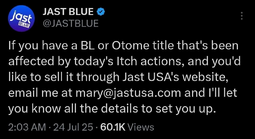 >>11466>I wonder though if the Itch.io purge will mean a lot of ENVNs will just be lost media or hard to findLast I heard, they relisted or were in the process of relisting all the purged adult games but forcing them to be free. Or maybe it was dependent on the dev opting in? I'm not sure. Hope nothing of value was actually lost. I hope some alternative pops up by the time I actually complete some shit of my own.