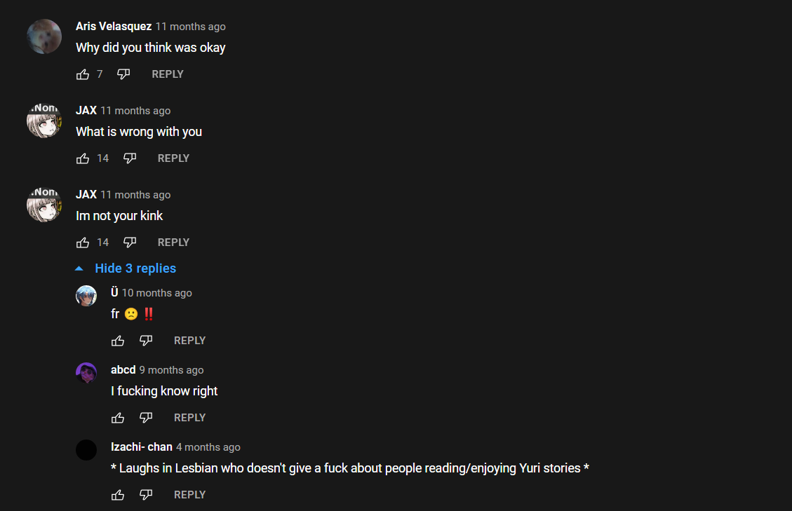 >>986>>987>>988"i'm not your fetish" "i'm mlm :(" you are a WOMAN what the fuck. it's so damn frustrating? you are literally trying to skinwalk an actual gay male and probably calling your hetero relationships homosexual. i just want watch anime boys fuck. what the hell