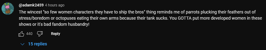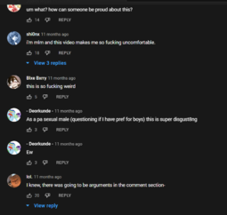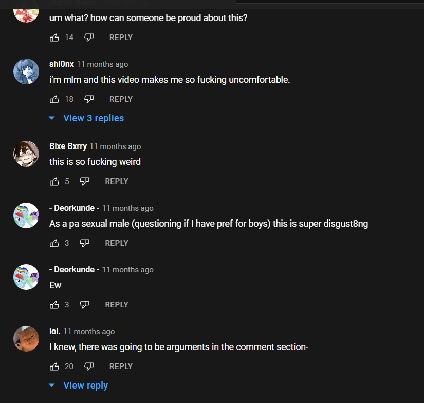 >>991yeah the only one of those commenters that seems to be an actual man is the "pansexual" guy but he also appears to have my little pony fetish art for his profile picture so I don't really value his opinion on what's disgusting or not