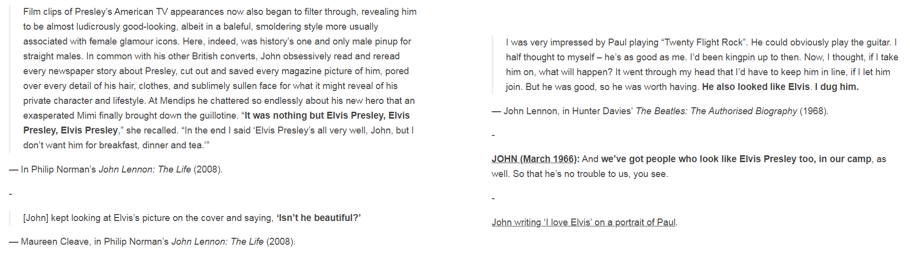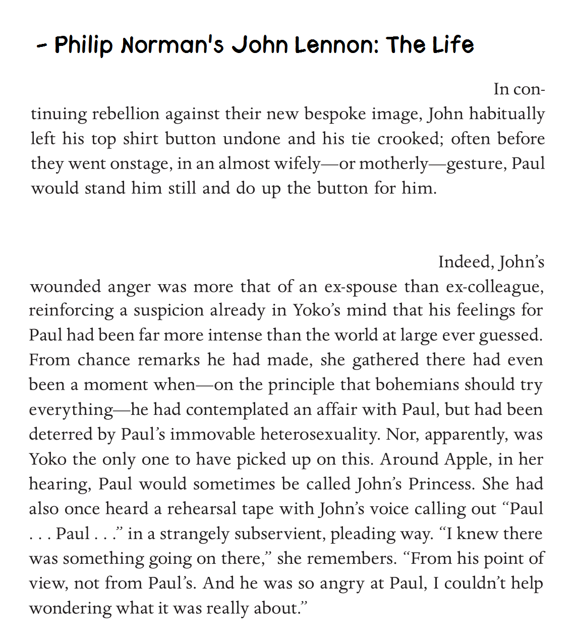 But yeah, give me some recs (especially of some crazy McLennon flavored ones.) I really expected the Philip Norman to be insane but it's mostly confined to one super paragraph and a few lines like saying that Paul 'wifely'. And showing how horny John was for Elvis.