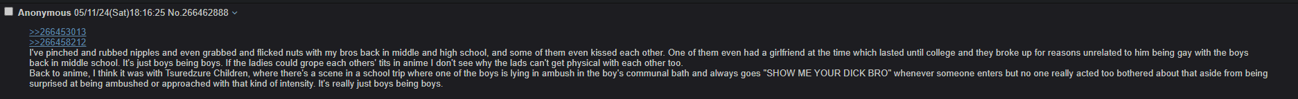 >>496>it's just boys being boysThe delusion is what makes this fetish for me.