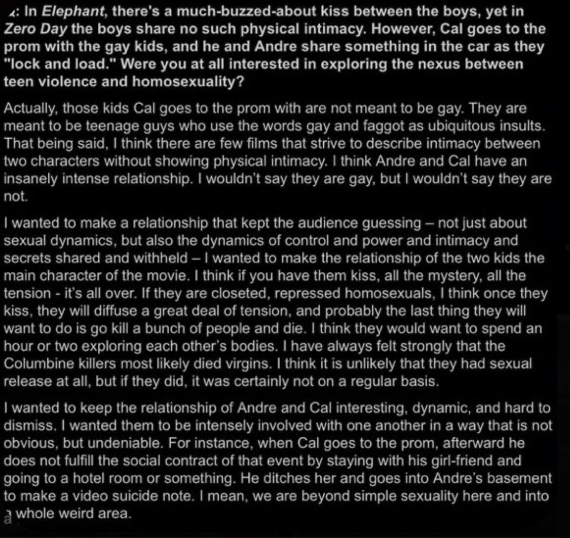 as for wether or not he was gay, that is an interesting question. there’s the “queerforkimveer” account and its other associated usernames, but that could have been tongue-in-cheek much like his joke posts about eric/dylan and columbiners. homosexuality being a punchline was not uncommon in 2012. and there’s also that one email where he said a gif of james holmes was “cute,” but that’s just anecdotal. honestly, i think that due to his abnormal psyche and documented sensory issues (as well as all of his problems with society), adam could better be described as having been basically asexual. but in another world, i think he’d seem bi-curious, at least.