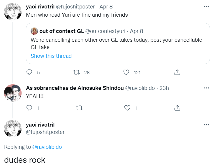>>82yeah fujo weebfem here. i'm pretty much a misandrist but also am attracted to men. it's the desire to see relationships without any misogyny or objectification of female characters. (i also like yuri but the soft uwu transbians put me off from engaging with the fanbase)