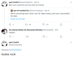 >>90While we're on the topic, the only fudanshis I've met have been only into the NSFW doujin side. Never do they actually enjoy the BL stories (understandable since they're written for women by women) but they're largely indifferent to them in spite of all the he/theys yelling gay fetishization. They don't really bother me because first of all they're extremely rare and secondly because they just don't care.