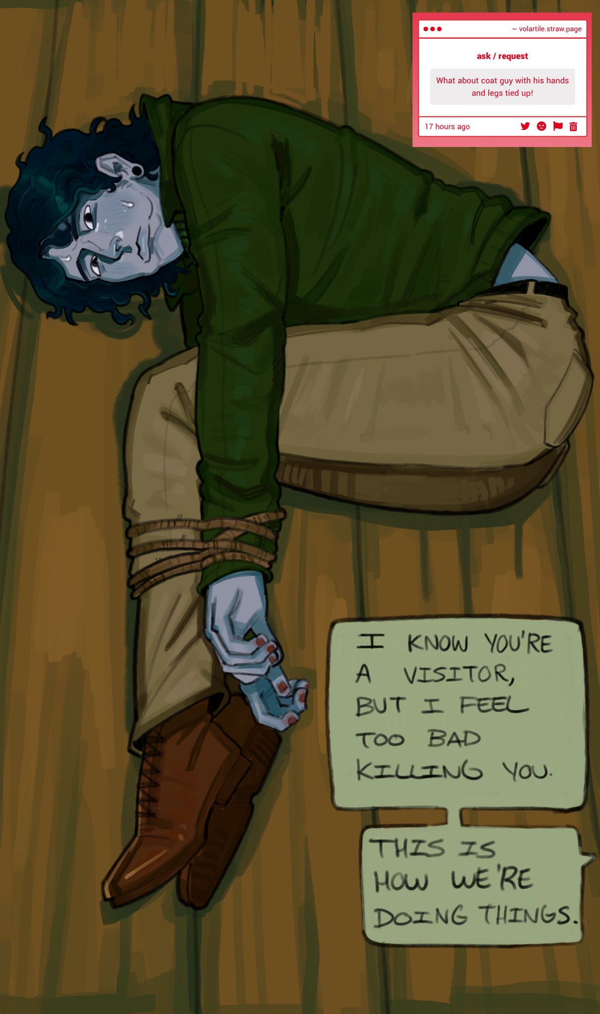 >>1385The game is set during a solar catastrophe, and humans can't really go out during daytime so they just live a nocturnal lifestyle, however that's not the only issue as "people" are starting to emerge from the ground. They're called visitors, and you can become one too as it's contagious. You'd think you have to be isolated from society but you can't, since there's a strange "man" (or Visitor, as the game refers to those who are infected/emerge from the ground) that visits you every now and then just to see if you're alone. You can't lie to him either since he's able to tell whether there are people in your hourse or not, so to avoid being killed by this being, you have to accept people inside your house, and kill them if you find out they're Visitors.