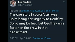 >>252>>253ken penders will always be one of my favorite trainwrecks to follow, in the days after the second movie was released he was whining about his legal contracts with sega lol