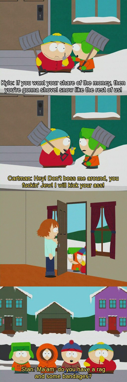 >>519Happy you're enjoying it so far! Butters is such an awesome fucking character. I love when the writers take advantage of how naïve he is and put him in ridiculously vulgar and dangerous situations that he doesn't understand the severity of. He's a good punching bag too, because you do feel bad for him but at the same time the shit he goes through is so absurd you can't help but laugh because of