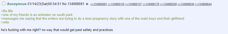 >>593I think Trey and Matt should just give the rights to South Park to the fujochan anons I think we could take the show in some interesting directions