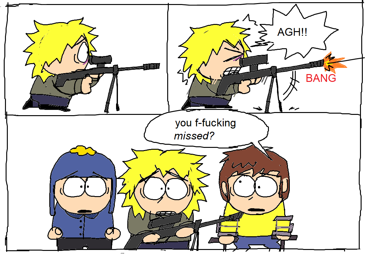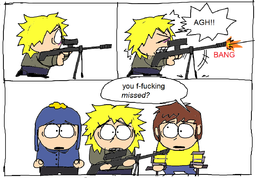 >>453>Favorite character?That's hard, I love too many of them for different reasons, probably a tie between Cartman and Tweek because of the child abduction episode and the bazooka joke.