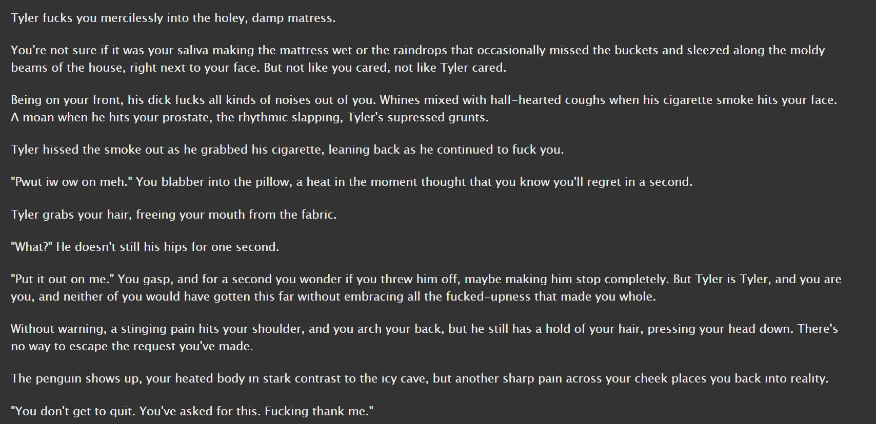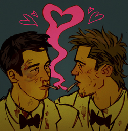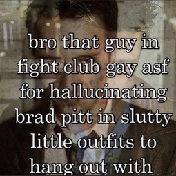 >>781Yaoi aside, the narrator seems to be in love with him like, in the fucking text. He's jealous of Marla when she fucks him, he's jealous of Angel face, and because Tyler liked Angel face and Tyler is the narrator, the subtext of beating up a man HE subconsciously liked says some shit about the narrator and I'm not sure if it was intended or not.