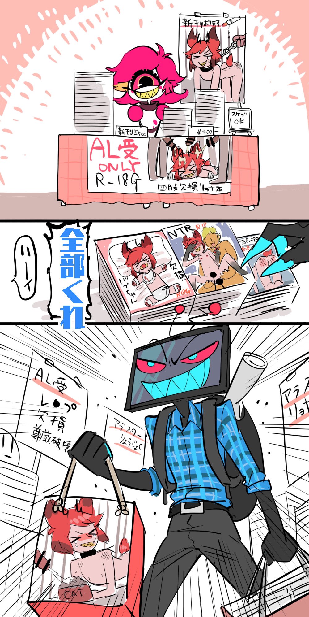 >>1422>>1423I imagine all three would have a different approach. The shorter guy simply pumps and dumps Alastor, usually requiring a blowjob and handjob. The taller muscular blond guy is more considerate, taking Al to fancy restaurants and hotels and fucking him, making Al scream for everyone to hear. But the tall, glasses guy would probably be the one to break Alastor. He made him do the most humiliating and degrading things until he was a broken mess