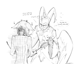 >>1173I read a fic a while back that did something interesting with the design and had Husk be bitter about the fact that he no longer had fingers and just had claws. He was angry dealing cards and opening bottles was hard and when he first got to hell it took him a while to learn to do basic things. I kind of wish more Hazbin fics focused on the characters adjusting to their new bodies or even just mentioned the weird features at all.